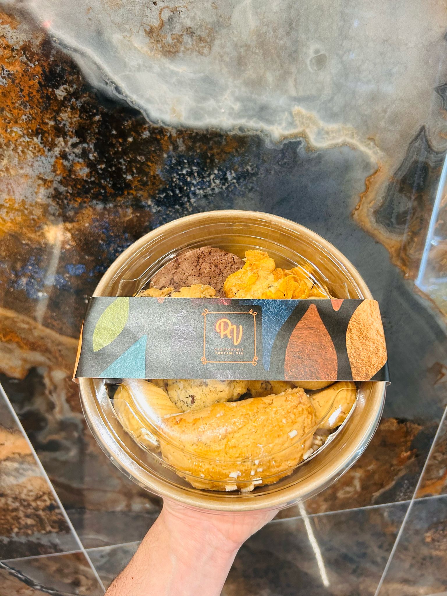Box contenente un "brutto ma buono", un cookies, una frolla classica, un "cioccosale", una rosa del deserto, un canestrello, un ferro di cavallo al cioccolato, un biscotto con marmellata di albicocche, una frolla montata, un ferrarese, un cantuccio noci e cioccolato.